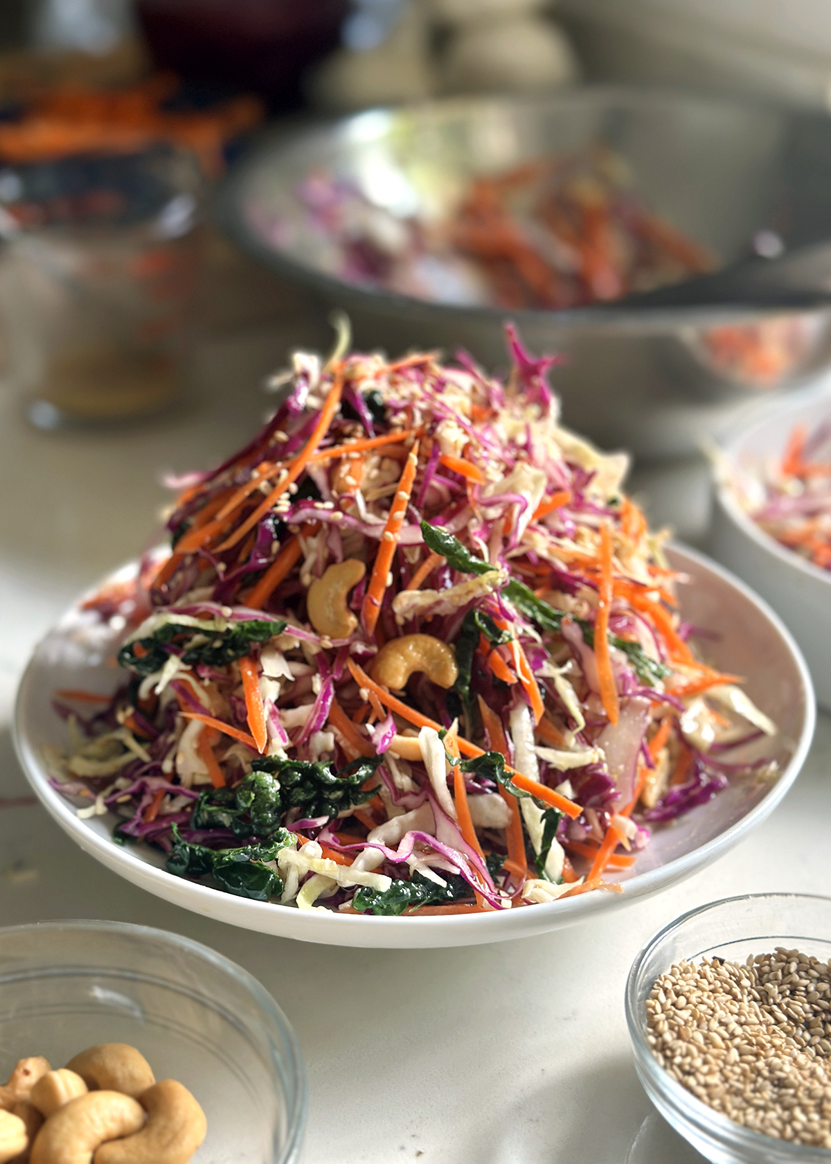 The brassicas, herbs, and dressing ingredients are high in phytonutrients that fight inflammation. The crunchy roasted salted cashews (and chow mein noodles if using) are what makes the salad craveable so that you want to eat all those good things, and miso in the dressing is a source of some gut-friendly fermentation, aka probiotics.